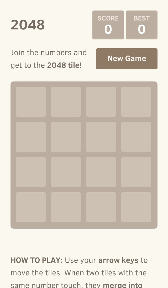 Neues SpielSo wird gespielt: Nutze die Pfeiltasten oder auf dem Handy deinen Finger, um die Kacheln zu bewegen. Wenn zwei Kacheln mit der gleichen Zahl sich berühren, verschmelzen sie zu einer!